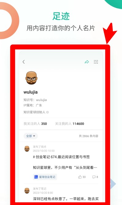 4、在“足迹”页面中可查看个人主页,通过发布内容、互动记录等构建属于你的专属名片形象。