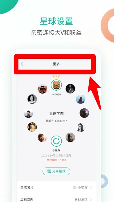 5、点击星球详情页右上角的“更多”按钮,进入设置页面,可进行星球信息管理、成员查看及内容整理。