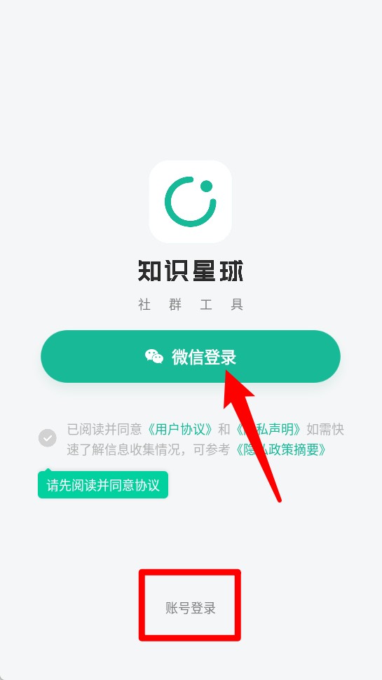 1、打开知识星球APP后,点击“微信登录”按钮即可快速授权登录,也可选择下方“账号登录”进入传统方式登录页面。