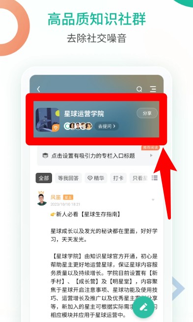 2、进入星球首页后,可点击顶部推荐专区“星球运营学院”,快速访问热门内容并查看星主推荐话题。