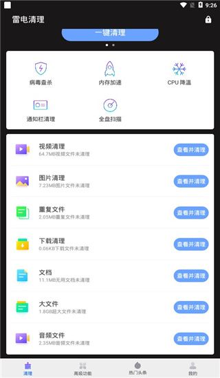 雷电清理最新版一款手机清理应用,它不仅能一键清理手机内存,快速删掉冗余文件,释放更多存储空间,让手机即刻恢复流畅运行,还附带多项实用功能,比如优化电池续航、给隐私应用加锁等。全方位守护手机性能与安全,操作简单却效果显著,轻松解决手机卡顿、空间不足等问题。