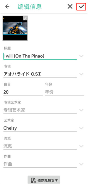 2、直接进入编辑信息界面后,点击音乐文件的专辑封面,在这个界面内修改要修改的文件信息。