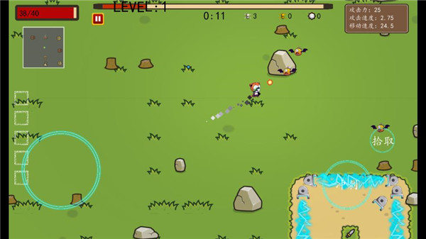 4、忘了人物选择,第一个人物射速快,移速快,每个地图可以额外发现一个宝物(但是目前有Bug,宝物刷新点可能在地图外面,导致拿不到)。第二个人物双枪,射速移速略低于第一个,但是双倍攻击啊!加上三件套就是双倍快乐。