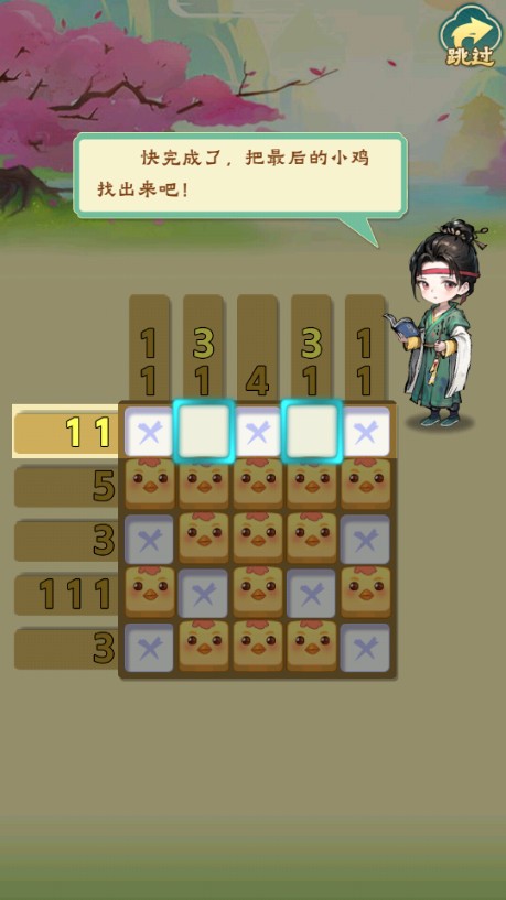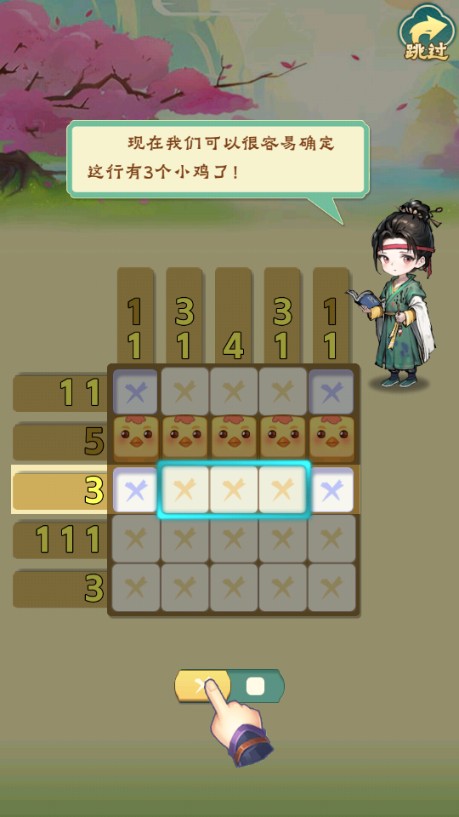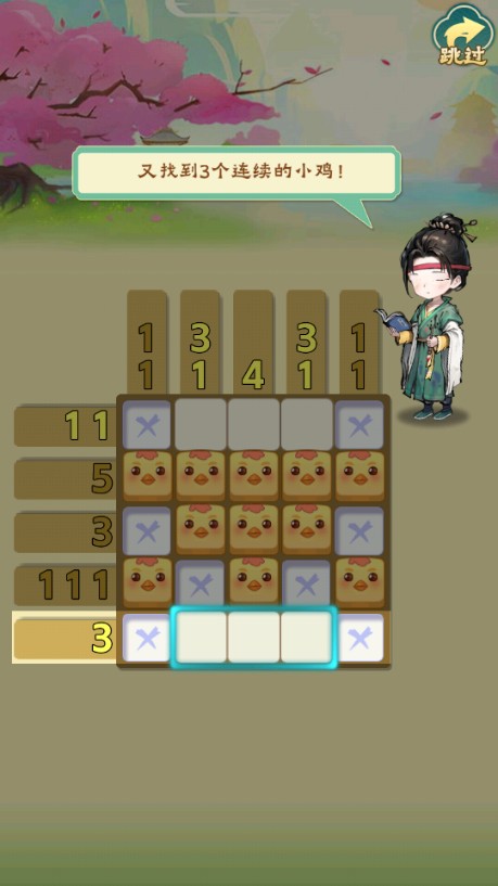 4、让我们从最简单的步骤开始,找刚好可以填满的一行,找出这5个小鸡!