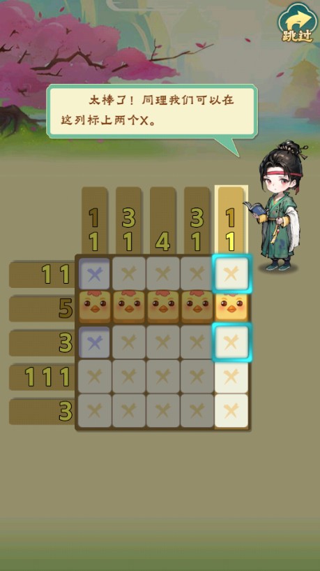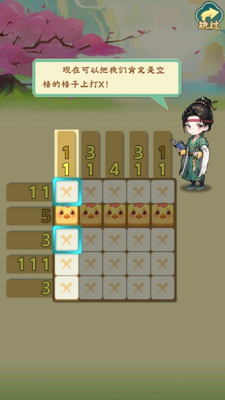5、让我们先看这一列,数字与小鸡数目一样,我们先切换到打X模式!