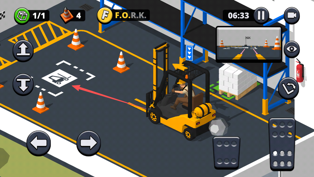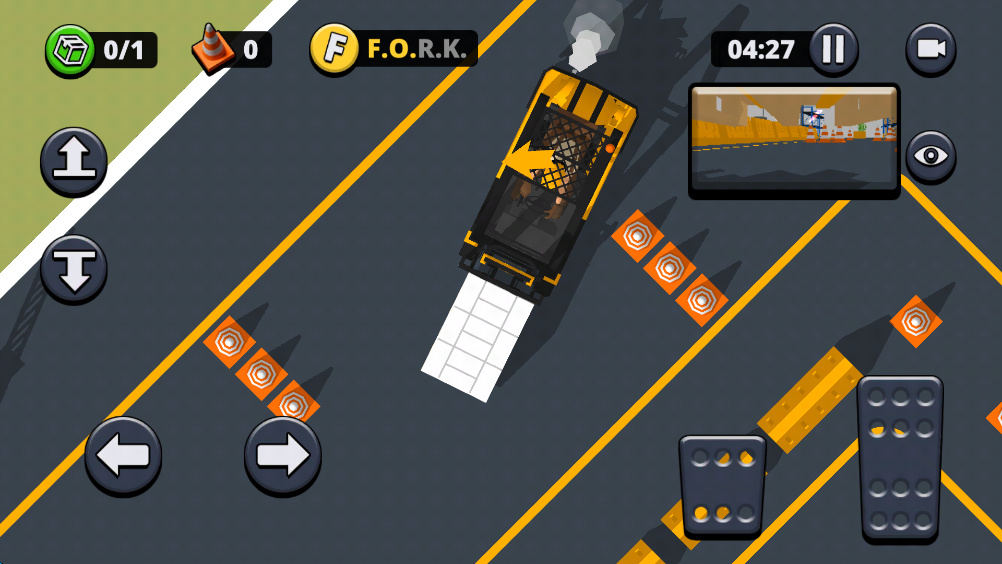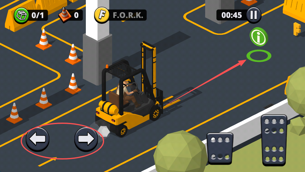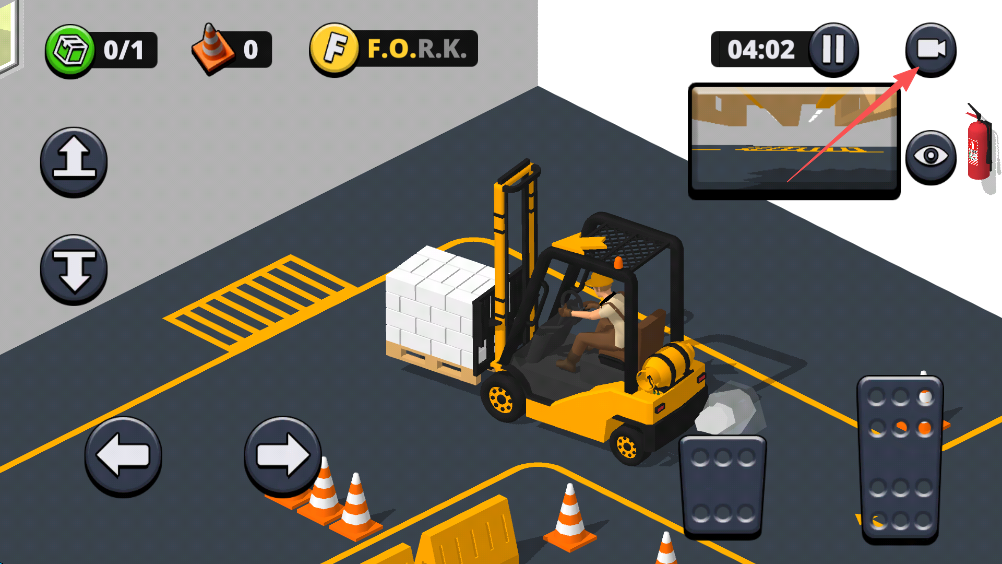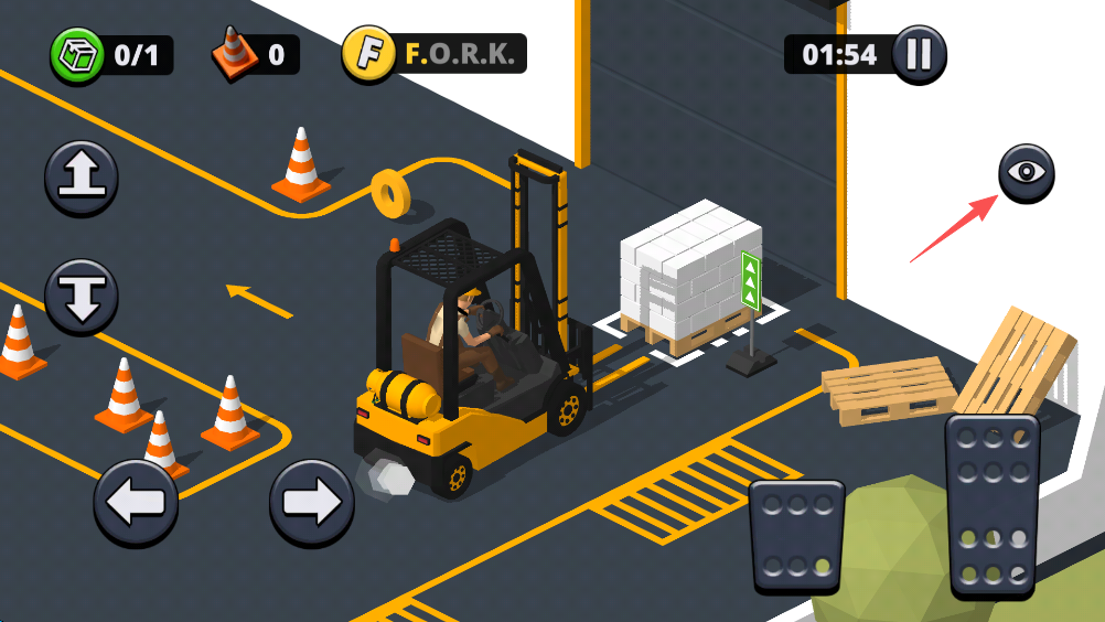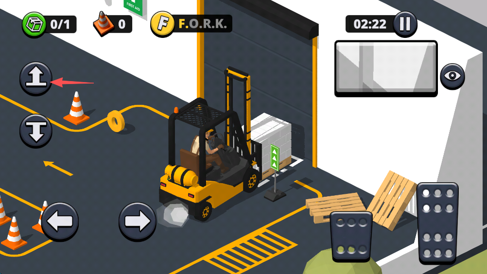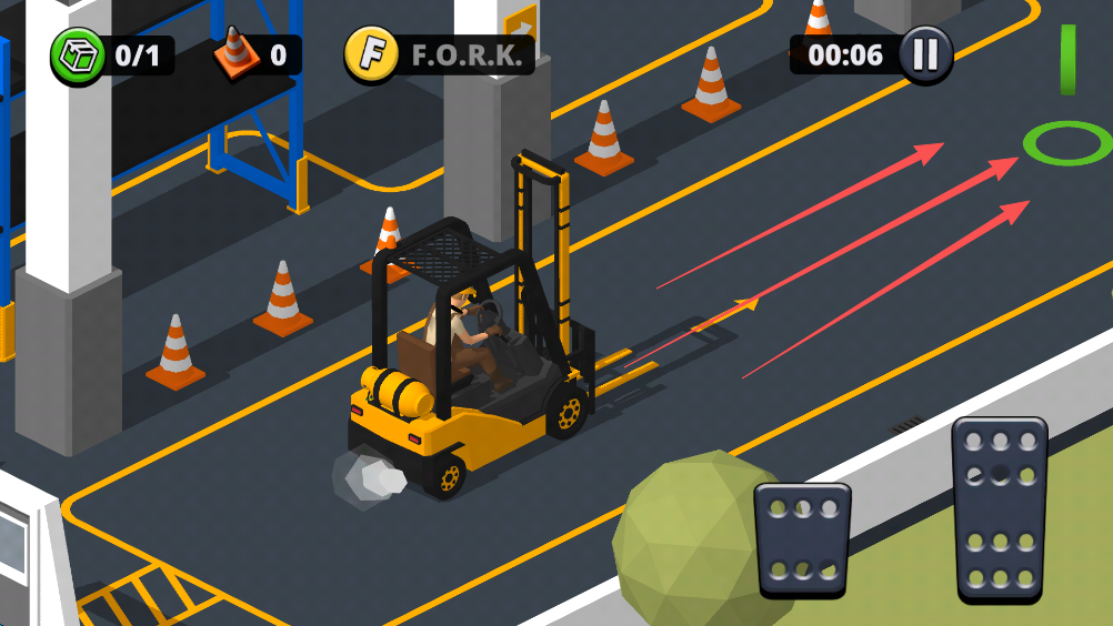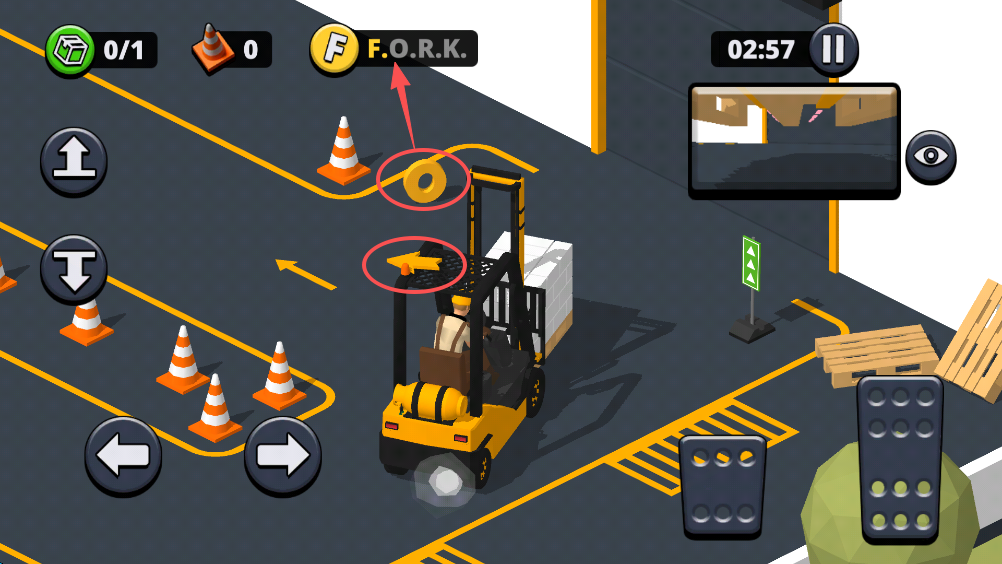 7、可以看到叉车上方有箭头标识,这是下一目标的方向,同是可以看懂地图上的“O”字母,我们每关都可以收集“FORK”这四个字母,想要三星通关,就必须需要收集了。