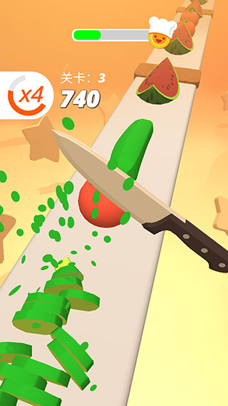 4、玩家只需要按住屏幕控制刀具疯狂切割水果、蔬菜,但是注意不要切到铁板和木板。 游戏中的食材丰富