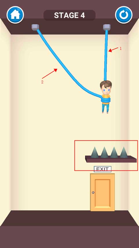 这次的尖刺放置在小男孩的下方,一旦检错绳子,就会死亡,玩家将不会得到金币兑换皮肤。这次还是按照我标注的顺序来剪绳子。