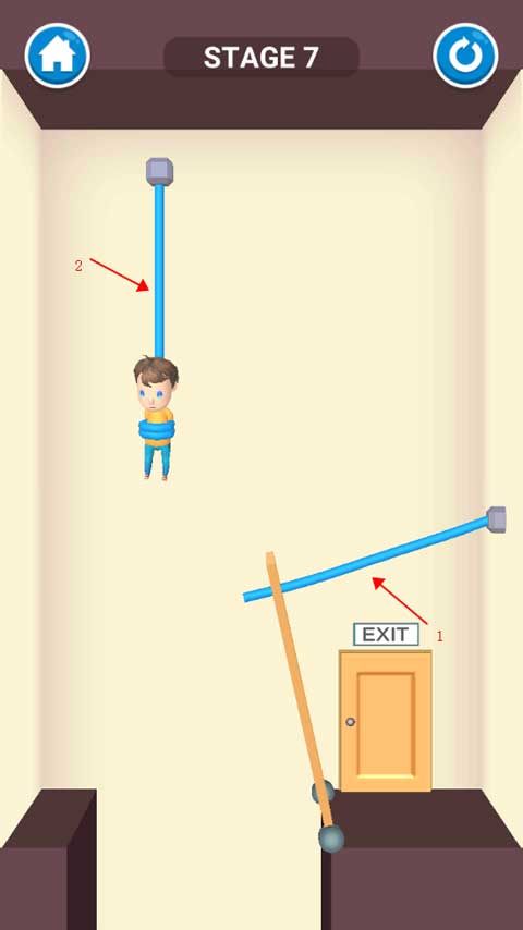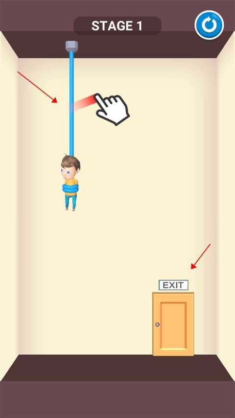 这关卡只是简单的用手指划过吊起小男孩的绳子,小男孩被解救之后就会自动走到出口,关卡通过。