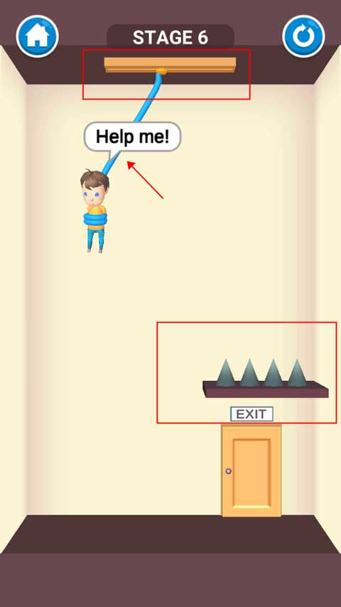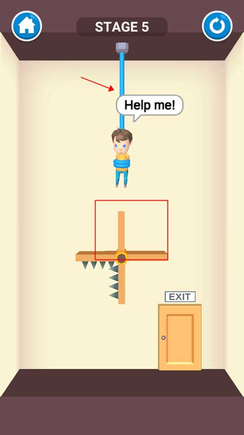 这次是将尖刺和滚轮结合,滚轮会进行左右滑动,玩家等待小男孩移动到左边位置时剪断绳子救他。