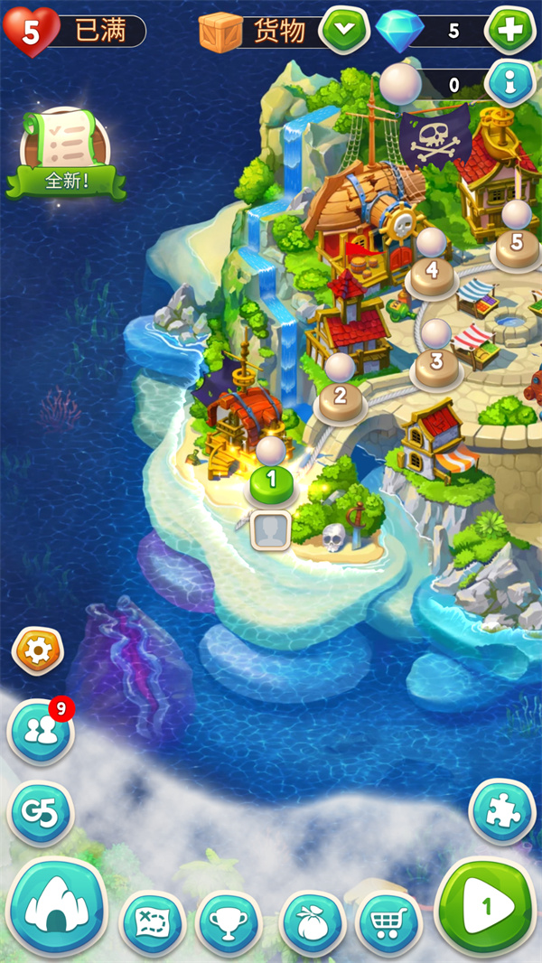 3、点击左下角的按钮可以切换到“航海”界面进行闯关,每通过一关都能获得一颗“珍珠”。