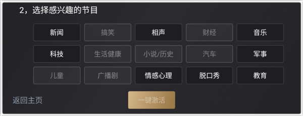 其次选择你感兴趣的节目,博谈天下选择新闻,相声,音乐,教育等节目,选择好之后点击一键激活即可进入主页。
