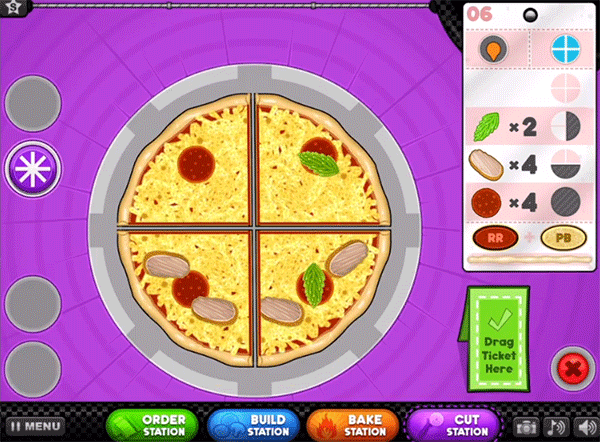 4、切成四瓣,记得在商店买切割指导,切披萨时会显示一个虚线,按照虚线切割即可。