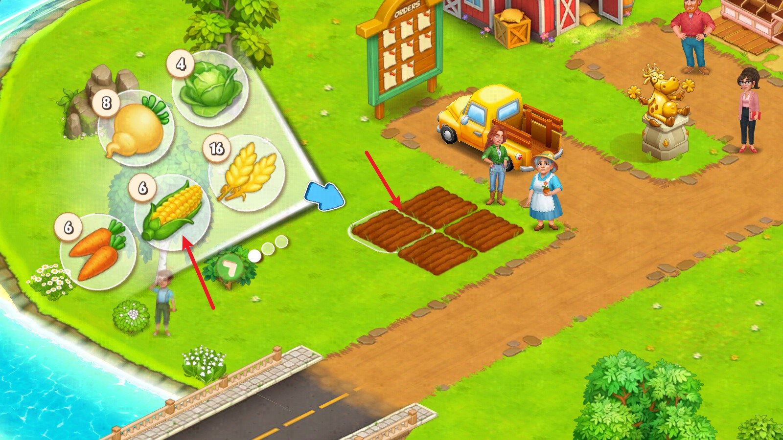 1、首先我们来尝试种植农作物,点击空地后,选择合适的种子,拖动即可种满田地。