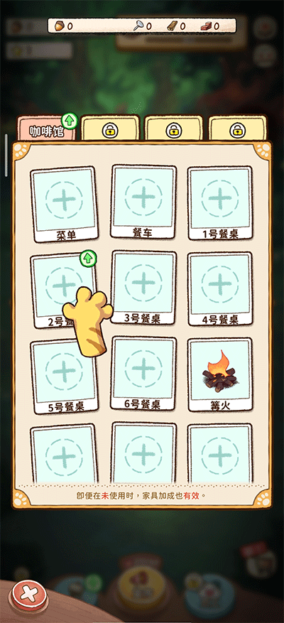 1、首先给咖啡馆建造一张餐桌,点击升级页面