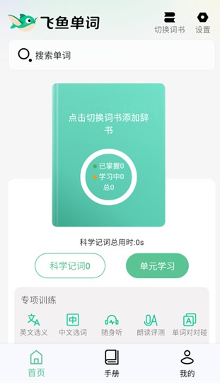2、点击添加词书或者切换词书,展开高效的学习,科学记单词