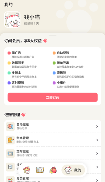 喵钱记账app是一款手机记账软件,可帮助用户记录每天的收支流水,并支持添加多种标签进行分类管理,方便在月底清晰了解各类支出详情,还能在软件中设定个性化的消费计划,当月的消费额度接近预设额度时,系统会及时发出提醒,助力科学理财。