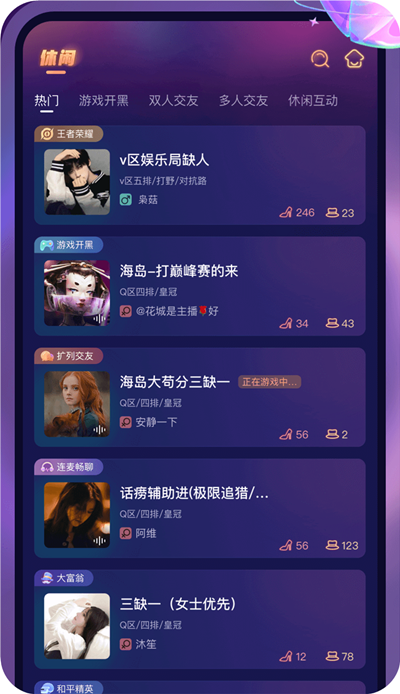 游戏分类:将所有的组队游戏推荐到首页中,可以通过分类查看支持组队的所有聊天开黑游戏;