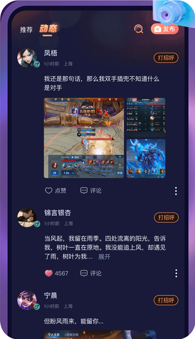 2、动态玩家广场可以查看其他网友们的游戏精彩瞬间,也可以发布自己的游戏高光时刻。