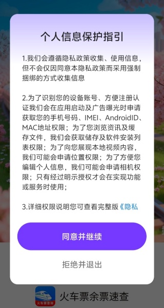 1、这款火车票查询软件的个人信息保护指引是需要大家点击同意的;