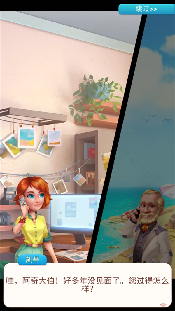 1、在开心电玩下载并安装好夏威夷三消狂热后打开游戏,观看开场动画了解故事背景。