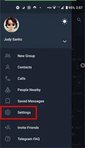1、打开nicegram后,点击左上角的三行菜单。当侧菜单出现时,点击 个人设置 选项。