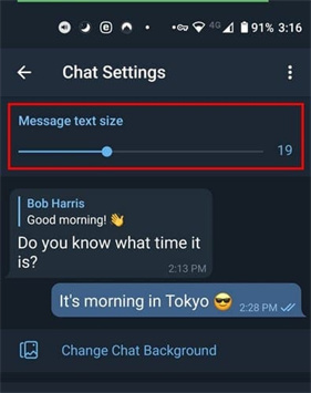 4、通过更改这些设置,Telegram 的文本大小将仅更改。只要您在聊天设置中,就可以执行其他作。通过调整这些设置,您可以为您的 Telegram 聊天提供您自己的个人风格。