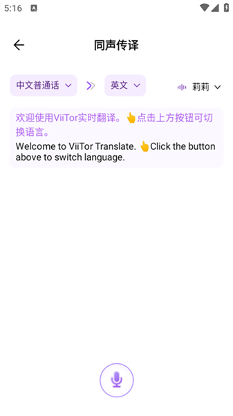 2、点击“同声传译”;选择源语言和目标语言;按住说话按钮,说完后松开,APP自动翻译并播报目标语言。