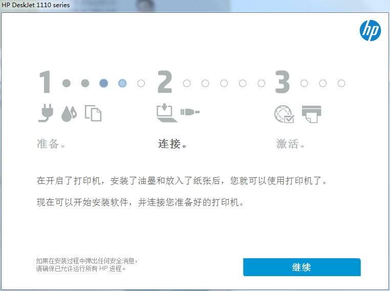 1、在华军软件园将惠普HP DeskJet 1112驱动下载下来,并解压到当前文件夹中,点击其中的DJ1112_Basicx64_61.exe应用程序,进入安装向导界面,接着点击继续。