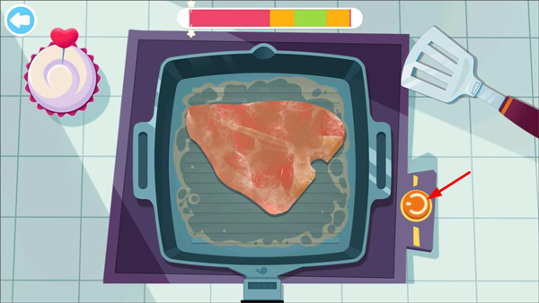 5、牛排腌制好之后,把它放入煎锅,点击右下角的开关,开始煎牛排;