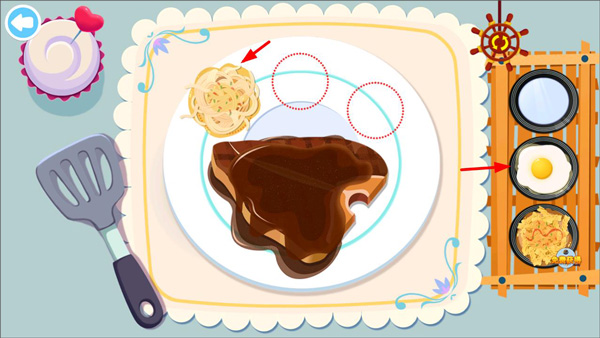 7、牛排淋上酱汁后,玩家根据客人的需求选择右侧的配餐添加到餐盘里;