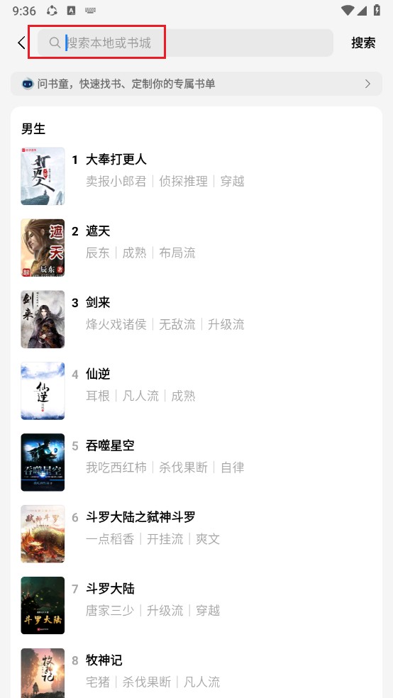 1、打开软件,在书城中点击上方的搜索框输入喜欢的小说。