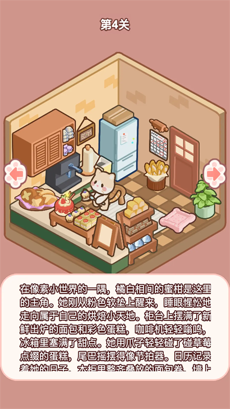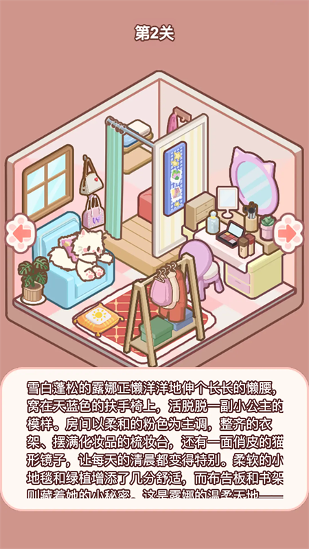 跟随指引将列表中的家具和猫放置到房间中正确的位置即可过关