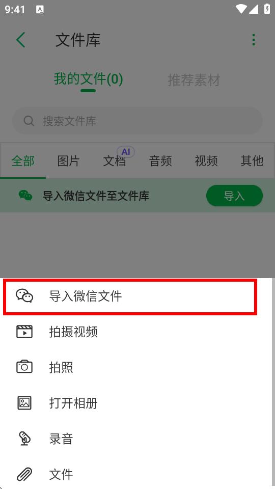 4、在弹出的菜单中,可选择导入微信文件等多种导入方式,也按照对应提示完成文件导入。