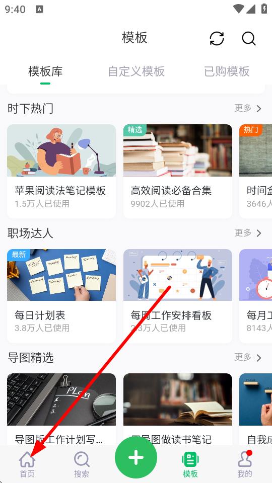 1、打开印象笔记app,点击底部导航栏中的首页选项进入首页界面。