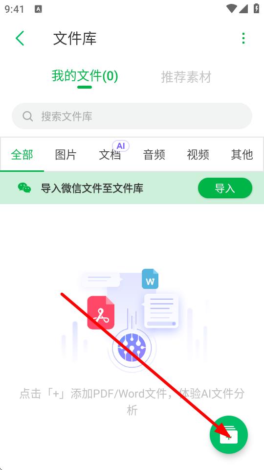 3、在文件库页面,点击右下角的绿色+号按钮。
