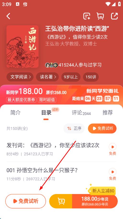 3、点击进入该名著的详情页面,在下方找到免费试听按钮,点击它。
