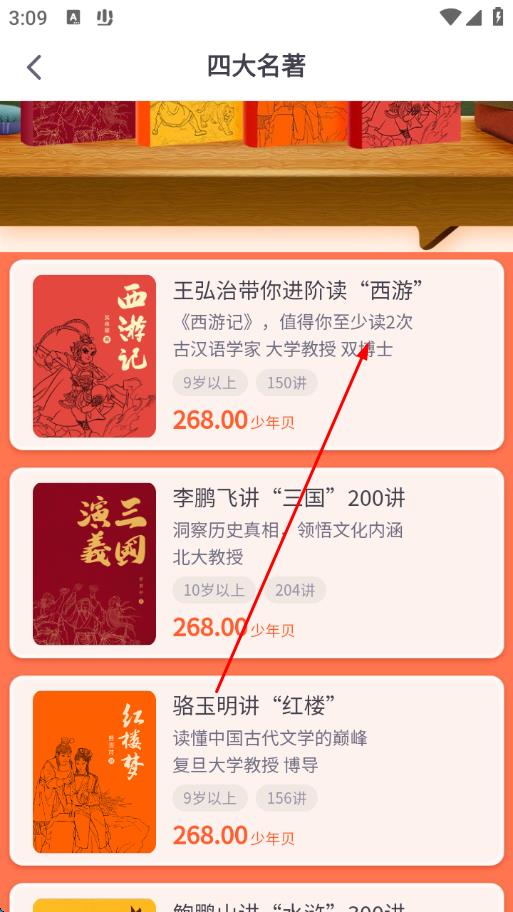 2、进入四大名著页面后,选择想要收听的名著内容,比如王弘治带你进阶读西游。