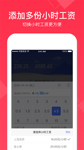 2、支持添加多个小时工资:用户可添加多个工厂的小时工资,记录时可根据实际情况进行选择;