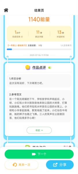 1、进入主界面后,进入对话练习,开始看图写话训练,浏览图片内容,创作故事并提交作品。