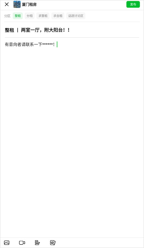 3、接着就是发布房源信息,填写好分区、标题、以及房子大概的信息,你还可以点击下方的添加图片视频等,最后点击发布就可以了,等待有意者联系您了。