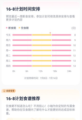 3、专属断食计划:具备多种常见的间歇性断食计划,包括16+8、18+6、20+4、23+1,并支持自定义计划,以满足不同用户的需求。