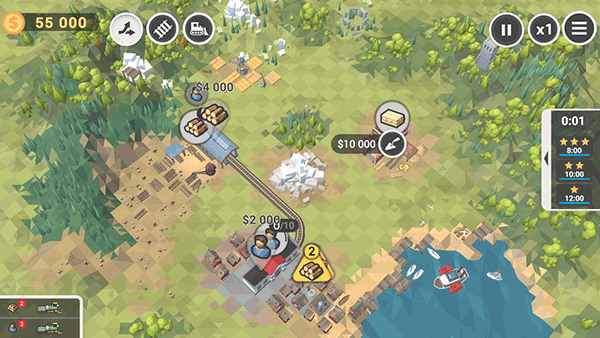 综合经营管理类玩法,共有50张地图可以体验,每张地图都相当于一个小型经济系统,首先是各种资源采集点,包括木材、石头、钢铁、粮食等多种基础材料,玩家需要把这些资源用火车运送到各加工厂,在规定时间内完成关卡生产目标,根据时间等因素给出星级评价,满分为5星。