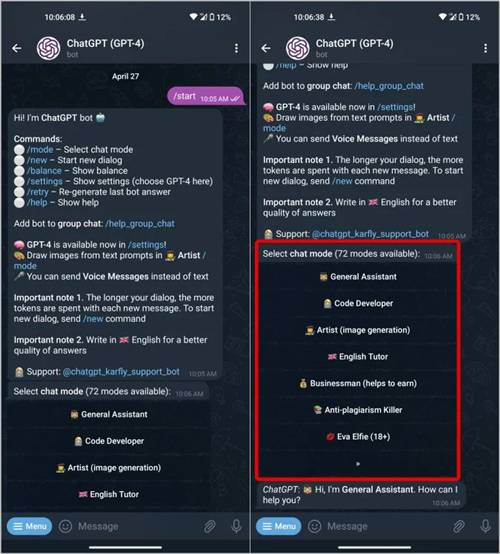 3. Karfly bot 支持通用助理、代码开发者、英语导师、邮件作者、翻译等不同模式。选择所需的模式并开始提问。您现在可以直接在 Telegram 聊天中与 ChatGPT 进行来回对话。