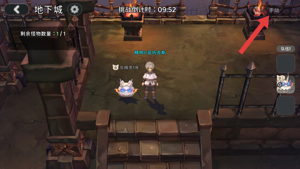 2、进入地下城,留意【挑战倒计时】和【剩余怪物数量】,点击【手动】按钮,将其切换成自动后,开始与怪物战斗。
