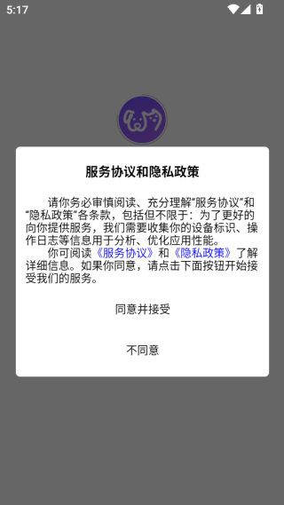 1、打开下载好的app,在弹出的服务协议与隐私政策界面,点击同意并接受。