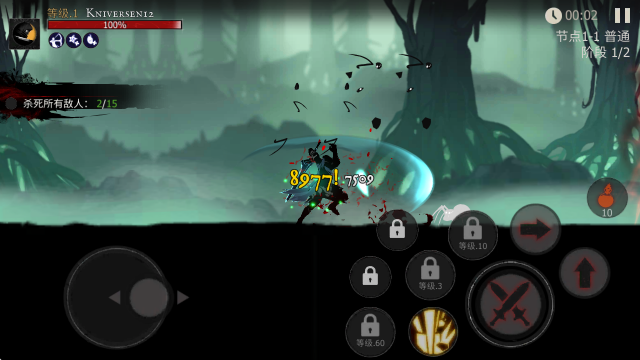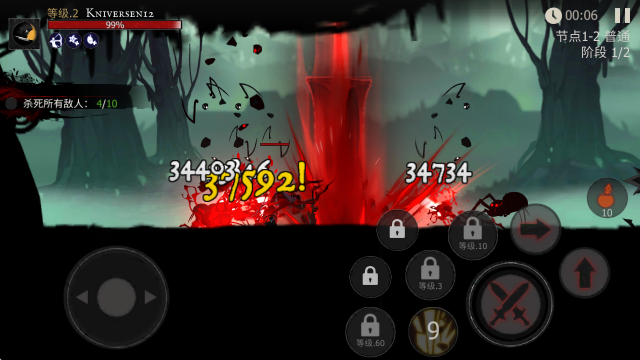 2、进入关卡后,拖动左侧摇杆移动,靠近敌人后即可进行攻击。