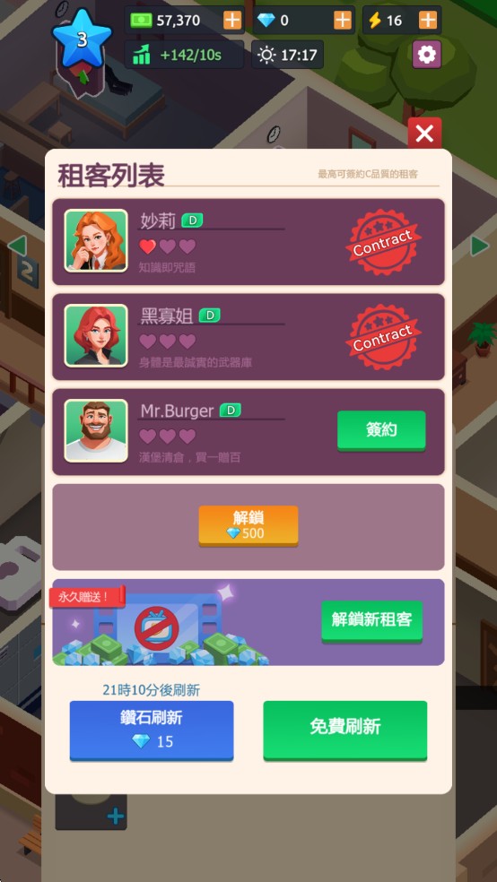 - 轻松点击升级机制与深度战略选择之间的平衡。自动收取租金,扩建房产,并优化租户满意度,从而实现利润最大化。