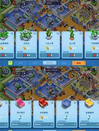 植物会增加健康值,沙发会提高快乐值,还有雕塑也能起作用。当病人路过雕塑植物时,双值就会增加。随着等级的提高,会有更多的医院装饰品选择和升级
