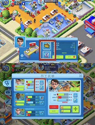 医生护士的等级越高,能力越强。并且医生护士的能力跟科室水平息息相关,科室的治疗水平取决于医生护士的技能值。只有医生进入了诊室,诊室才可以治疗病人。